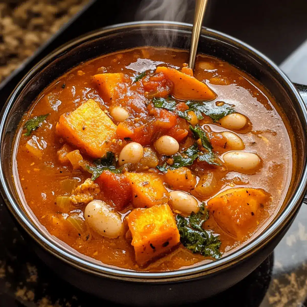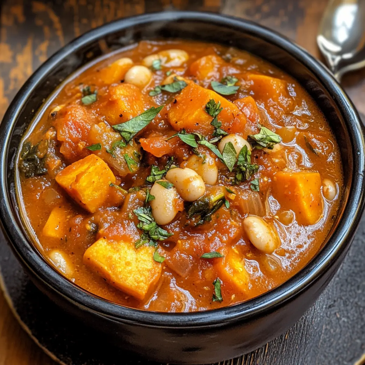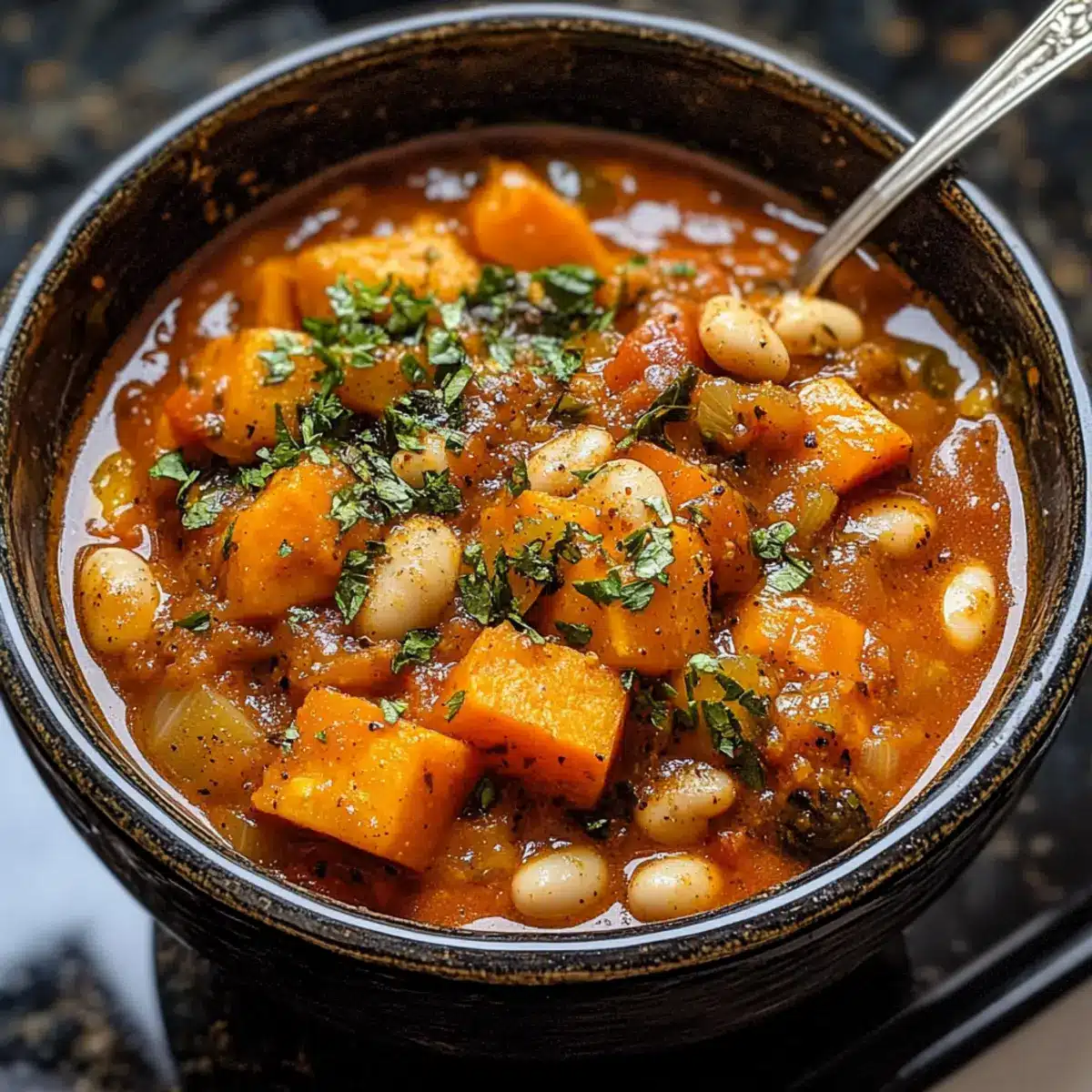 Herzhaft und nährstoffreich: Dieser Eintopf ist vollgepackt mit köstlichen Zutaten wie Süßkartoffeln und Bohnen, die dich sättigen und glücklich machen.