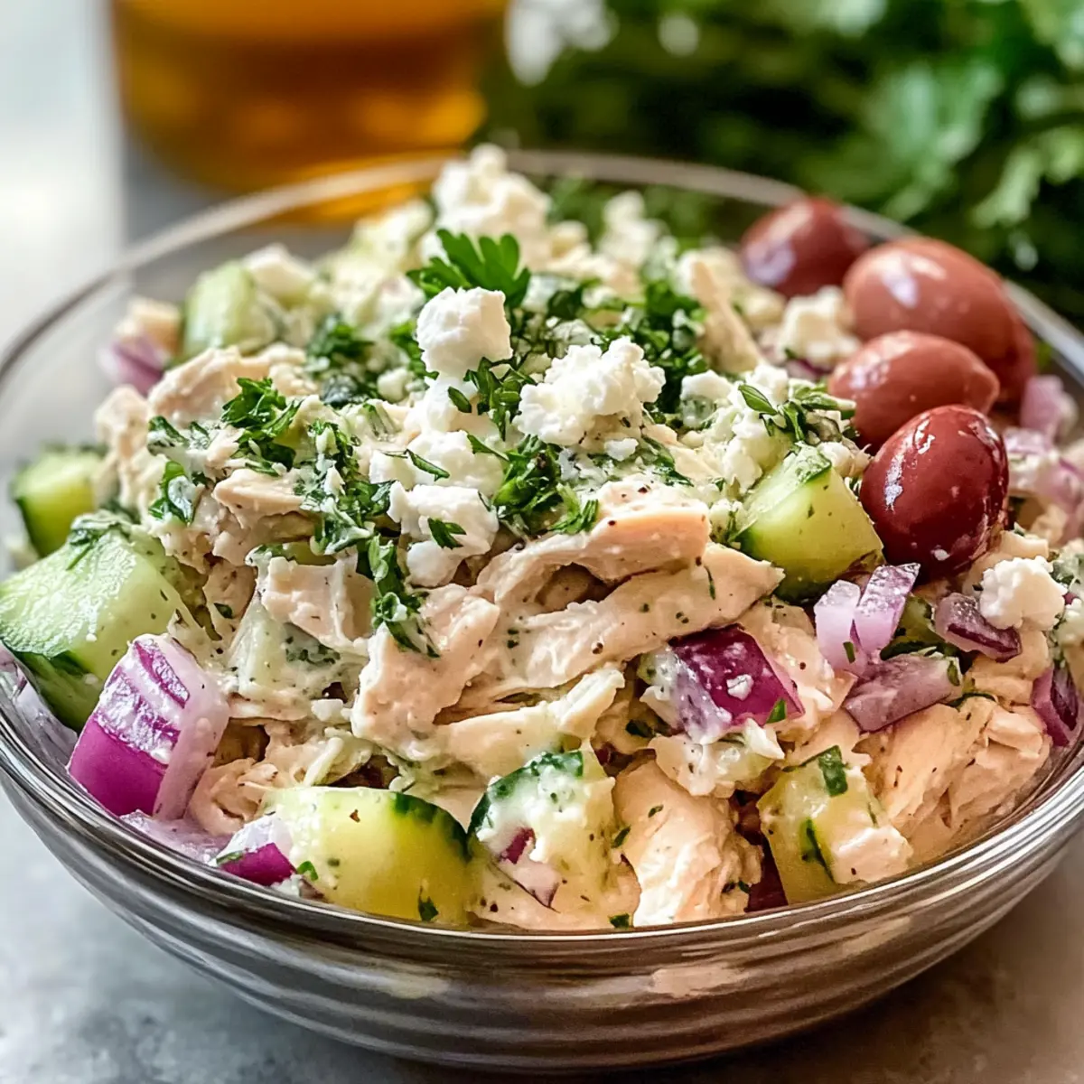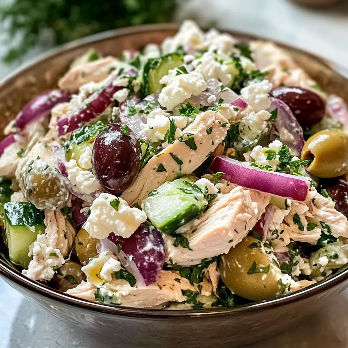 - Füge das zerfledderte Hähnchen, die rote Zwiebel, die Kalamon-Oliven, den zerbröselten Feta und die frische Petersilie hinzu und mische alles vorsichtig.