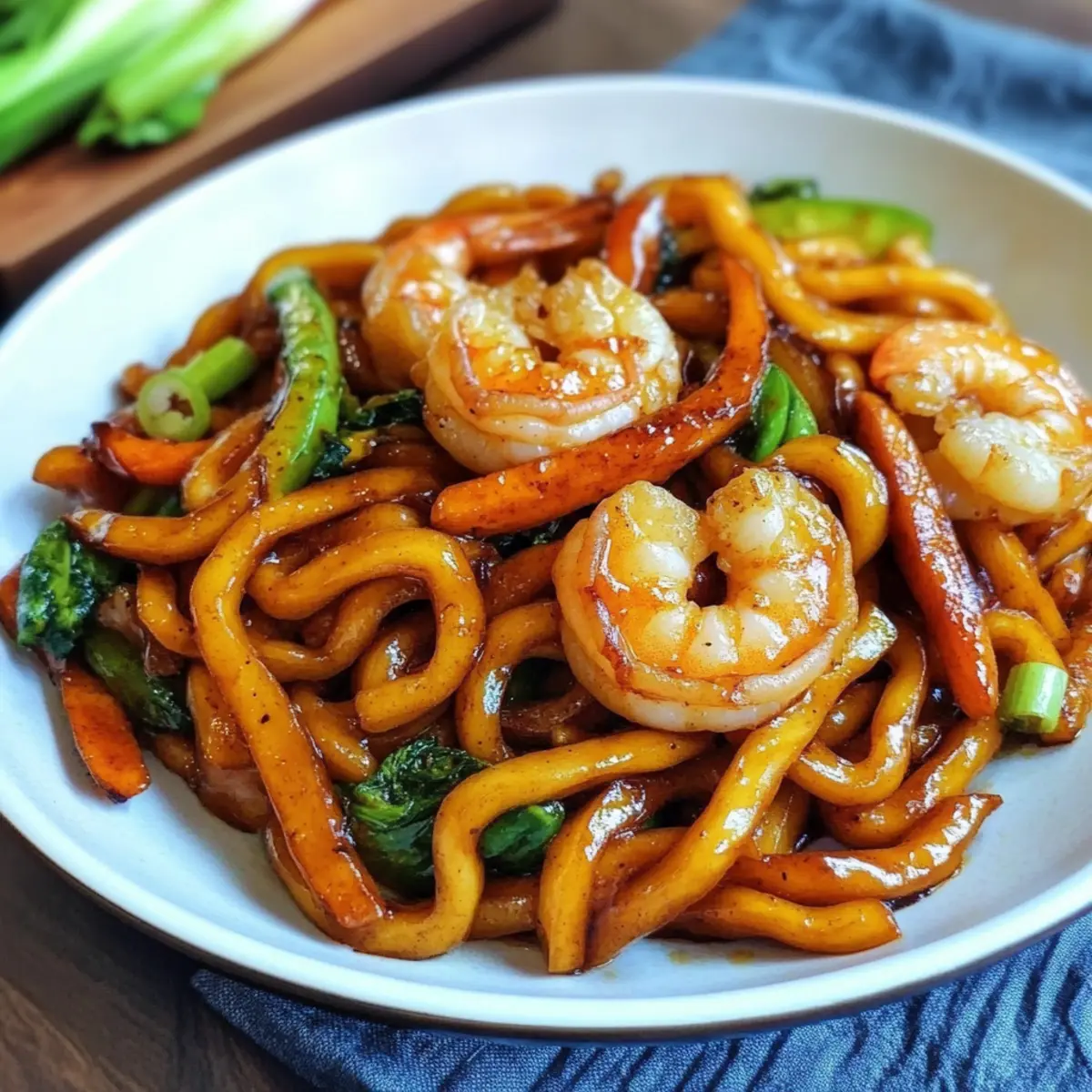 Schnelle Yaki Udon mit Garnelen und Gemüse