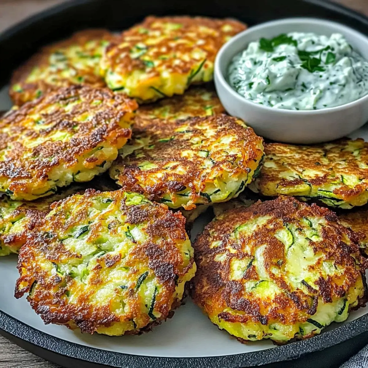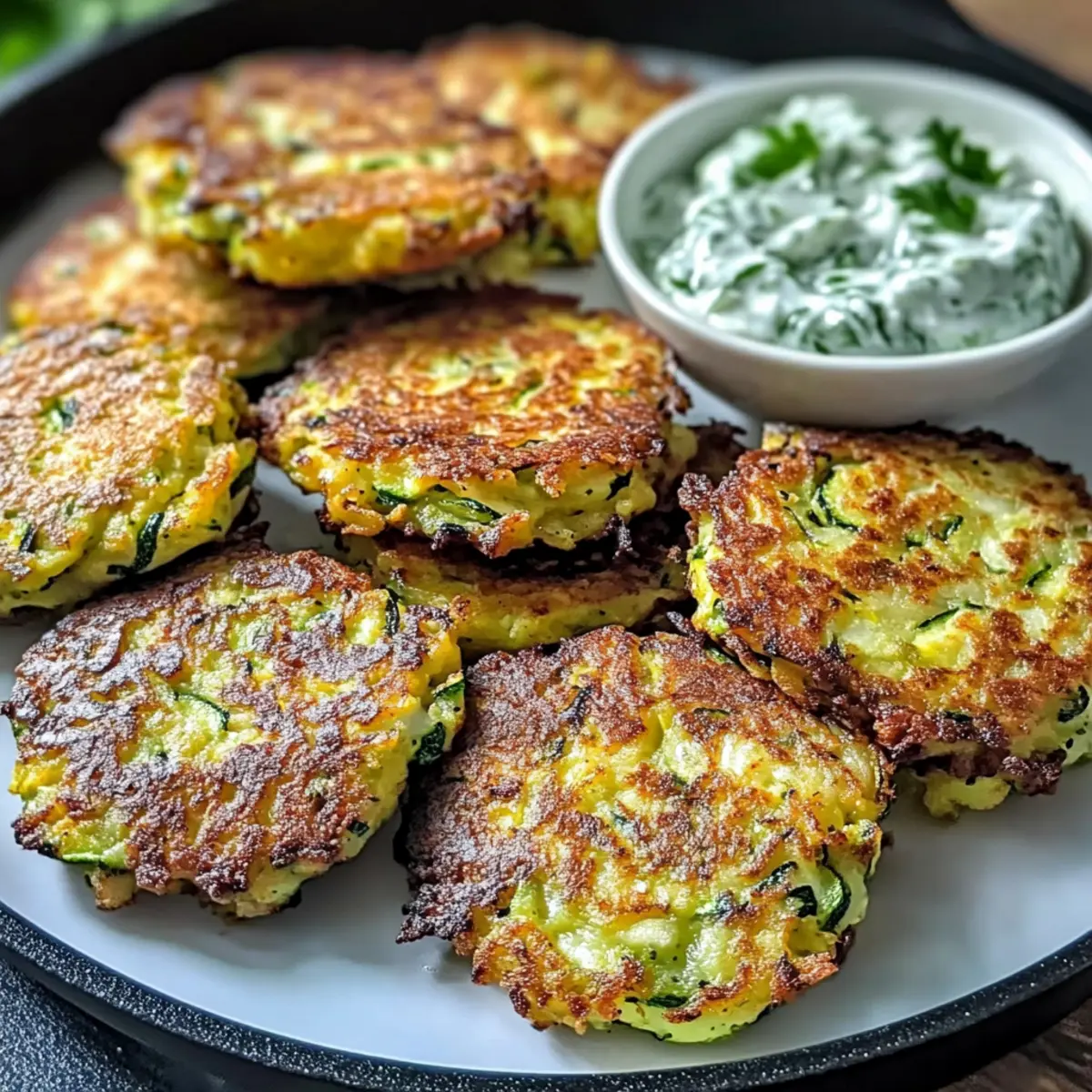 - Servieren Sie die Zucchini-Puffer warm mit einer Dip-Sauce nach Wahl.